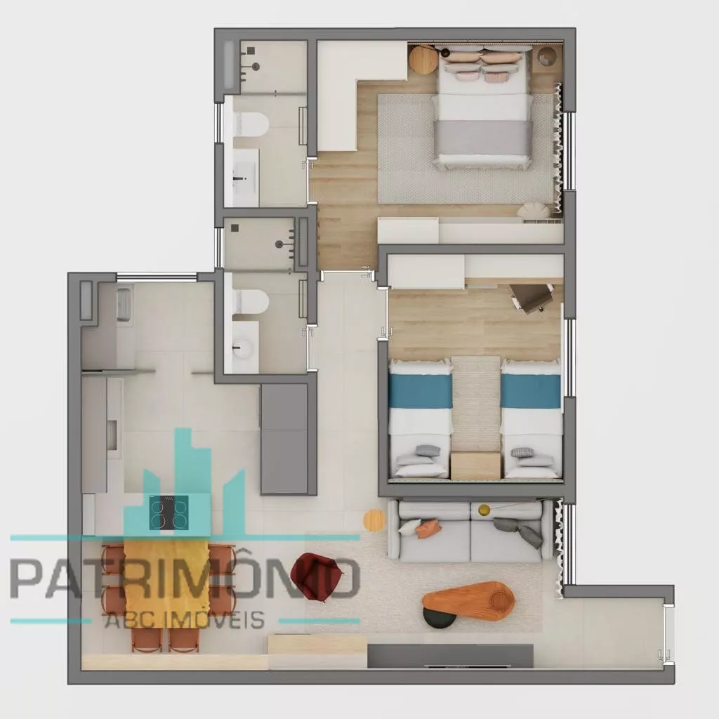 Descrição: 2 dormitórios sendo 1 suíte, sala 2 ambientes, cozinha, banheiro, área de serviço e 1 vaga de garagem.