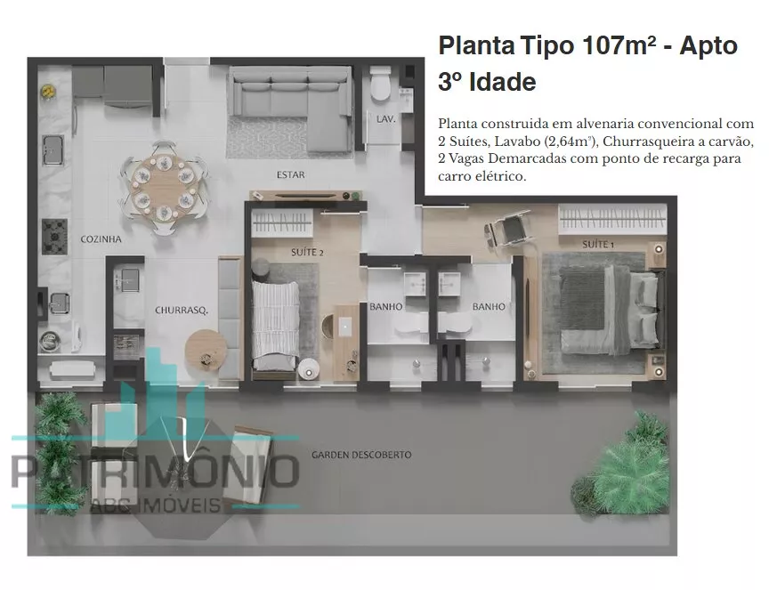 Descrição: 2 suítes, sala ampla, varanda gourmet, cozinha, lavabo, área de serviço e 2 vagas de garagem com ponto de recarga para carro elétrico.