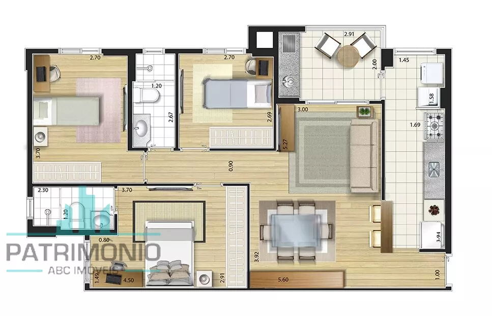 Descrição: 3 dormitórios sendo 1 suíte, sala 2 ambientes, varanda gourmet, cozinha, área de serviço, banheiro social e 2 vagas de garagem.