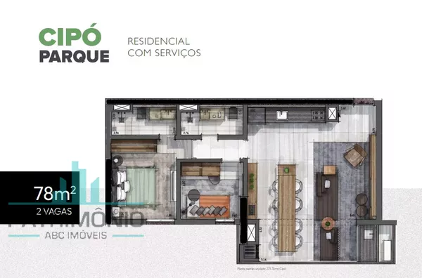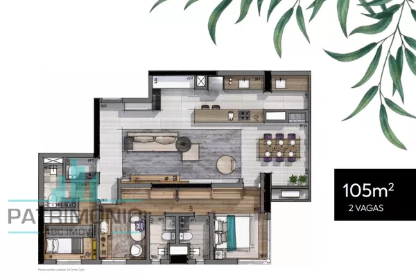 O apartamento possui 2 dormitórios sendo 1 suíte, amplo home integrando a sala de TV e jantar com a cozinha, varanda gourmet, área de serviço, banheiro social e 2 vagas de garagem com depósito.