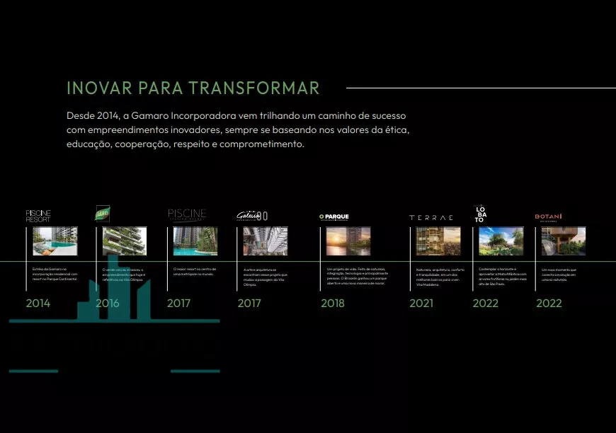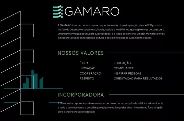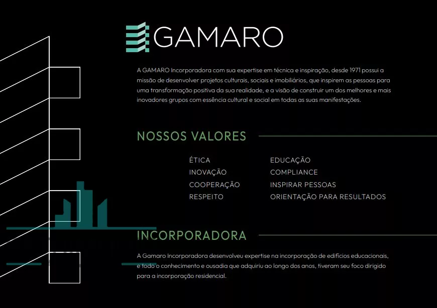 A Gamaro Incorporadora, ao acreditar na interdependência como princípio norteador de trabalho, ou seja, na crença que meio ambiente, pessoas e atividades estão relacionadas e dependem uns dos outros, apresenta, em meio ao desenvolvido bairro do Brooklin, o complexo O PARQUE, um empreendimento luxuoso que trará o conforto e praticidade que você e sua família merecem!