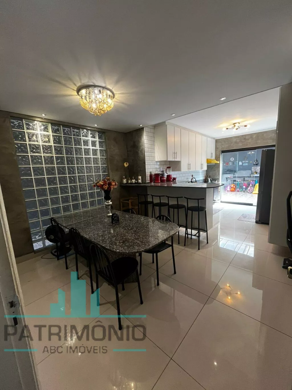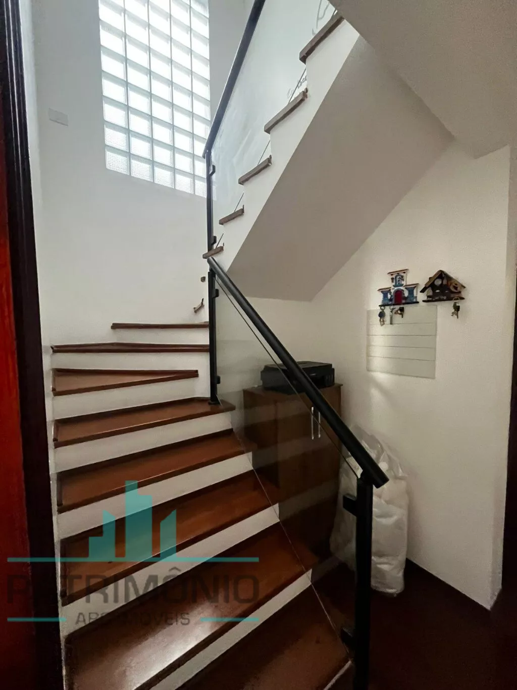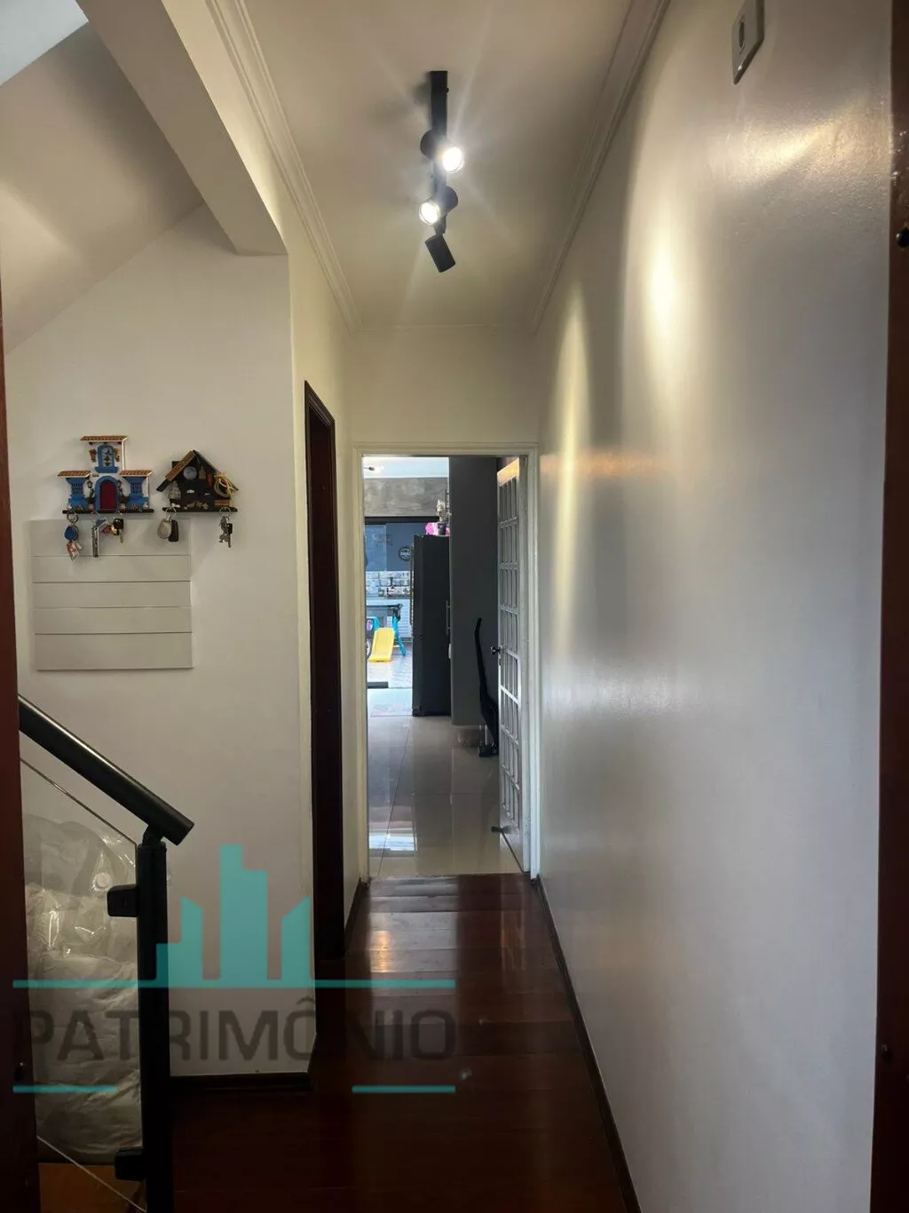 Na parte inferior, há uma ampla sala de estar (com possibilidade de 2 ambientes), sala de jantar integrada à cozinha grande e arejada com planejados, banheiro social e quintal privativo nos fundos totalmente coberto, sendo metade com telhado retrátil em policarbonato transparente e churrasqueira de alvenaria.