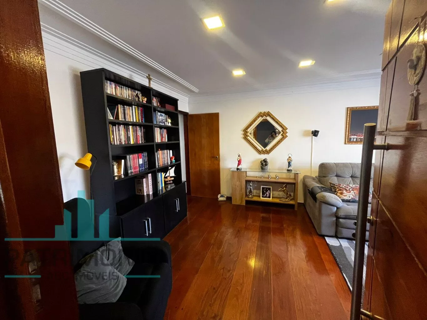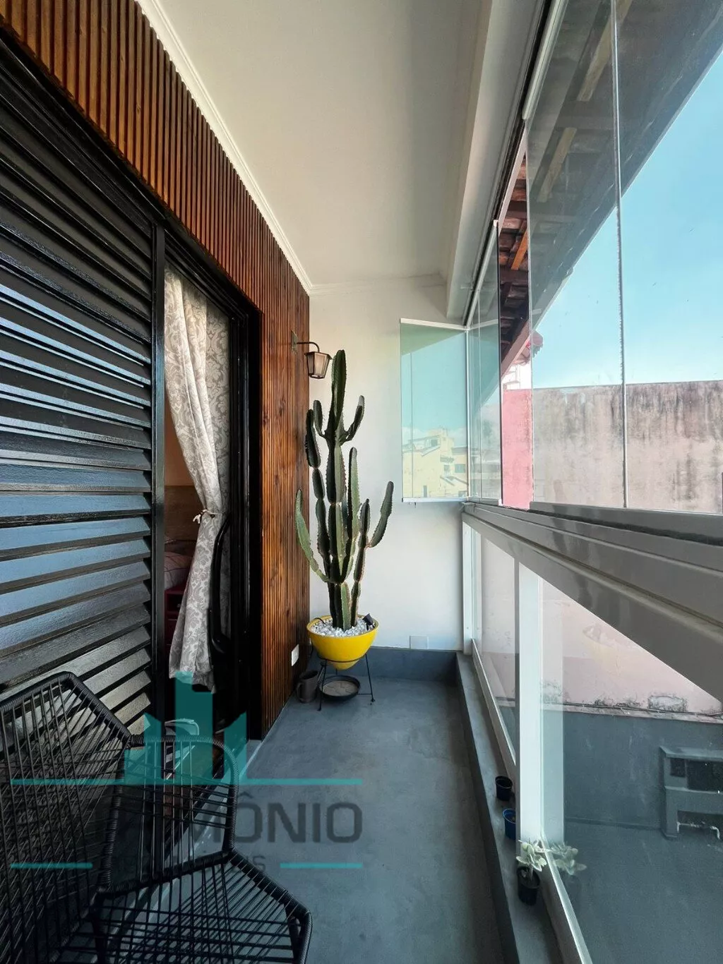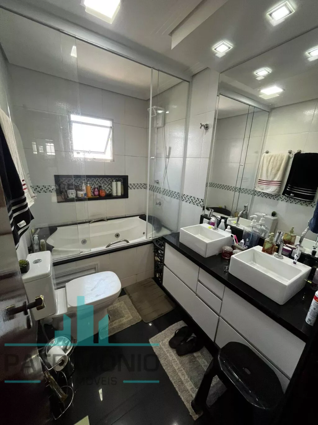 Na parte inferior, há uma ampla sala de estar (com possibilidade de 2 ambientes), sala de jantar integrada à cozinha grande e arejada com planejados, banheiro social e quintal privativo nos fundos totalmente coberto, sendo metade com telhado retrátil em policarbonato transparente e churrasqueira de alvenaria.