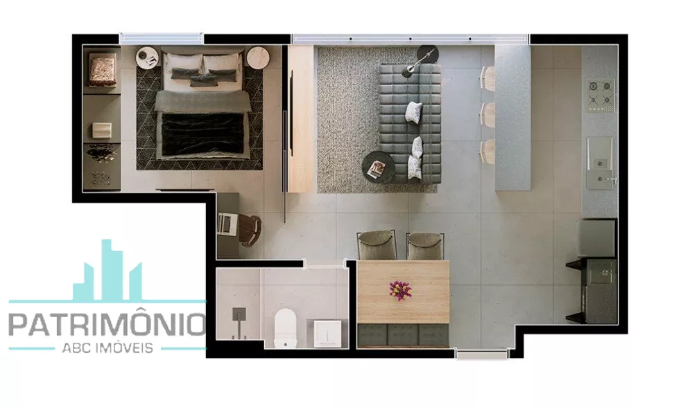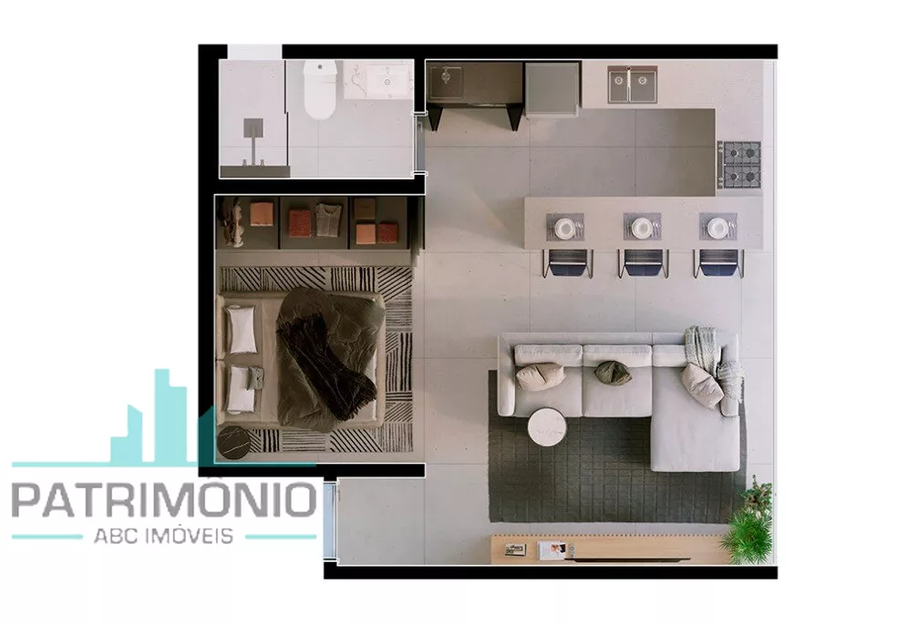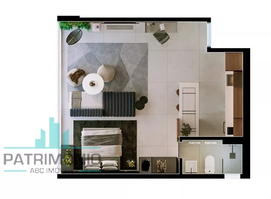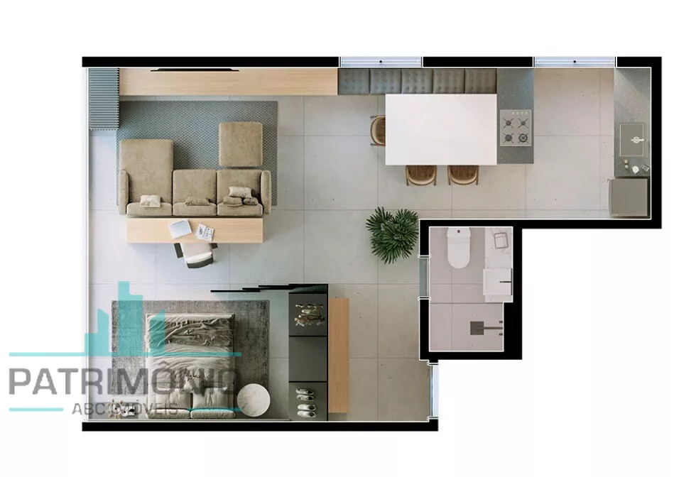 Apartamento tipo Studio com 1 ou 2 dormitórios, sala, cozinha, banheiro e área de serviço.