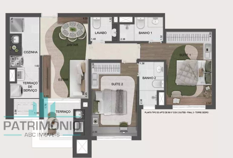 Unidades de 68m² com 2 suítes, sala com terraço, cozinha, lavabo e área de serviço, com preços a partir de 726.231,00 (sujeito a alterações de valores, consulte tabela com nossos corretores)