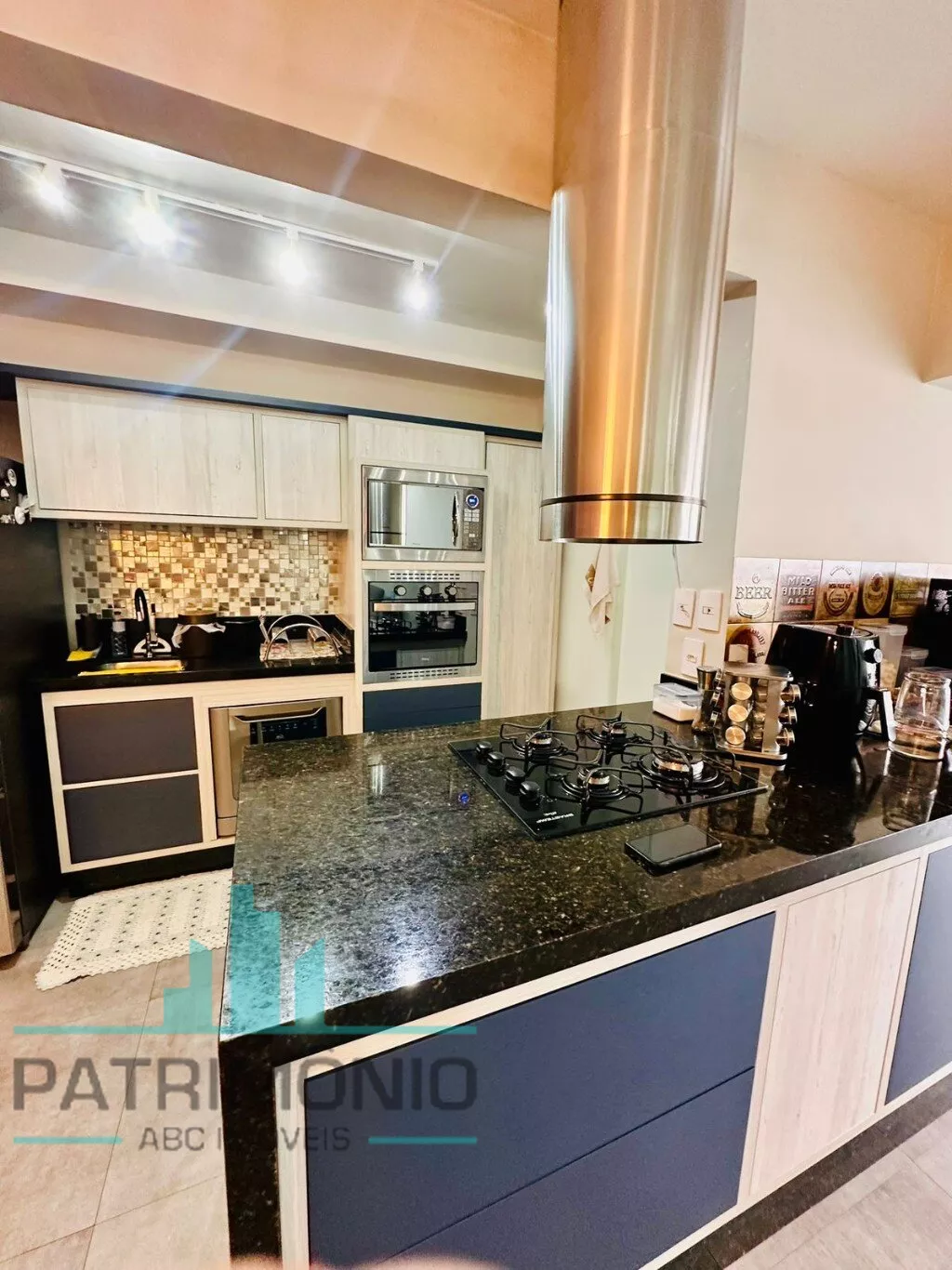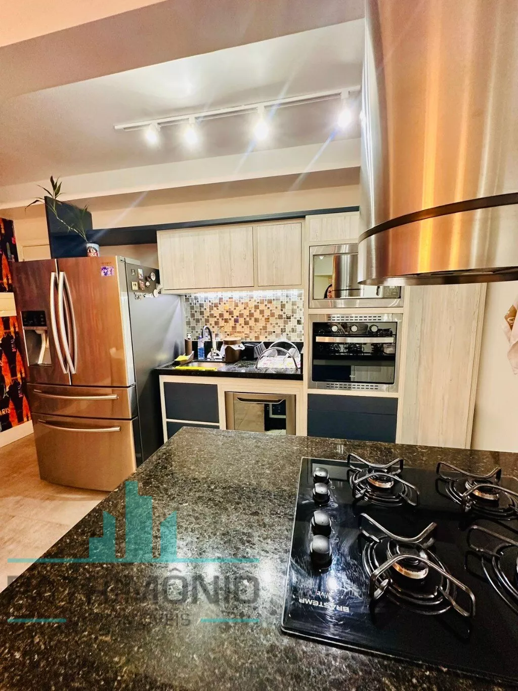 Cozinha planejada com armários, cooktop, coifa e forno elétrico